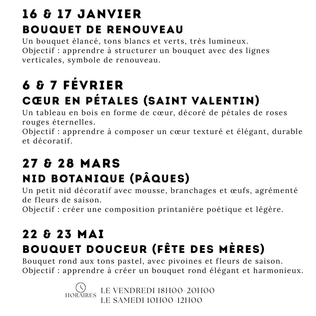 Les ateliers sont guidés pas à pas, dans un esprit de simplicité, de convivialité et de respect du rythme de chacun. La Maison propose des ateliers d’art floral tout au long de l’année, dans deux formats au choix.